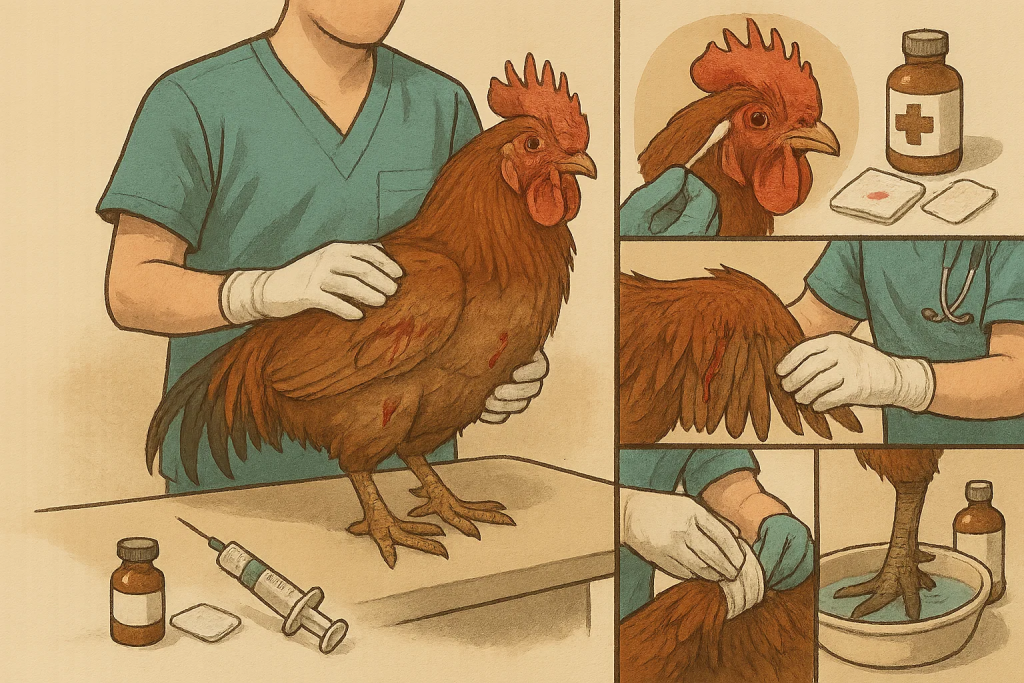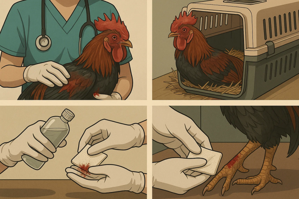 Gạc vô trùng, băng mỏng, băng dính y tế giấy; nước muối sinh lý; dung dịch sát trùng nhẹ; kéo đầu tròn, nhíp nhỏ, đèn pin; thùng/giỏ có nắp thoáng để vận chuyển; nhiệt kế môi trường, đệm sưởi an toàn; sổ theo dõi. Chuẩn bị sẵn giúp bạn không hoảng, rút ngắn thời gian chần chừ, bảo toàn “giờ vàng”, tăng cơ hội hồi phục cho gà trống.