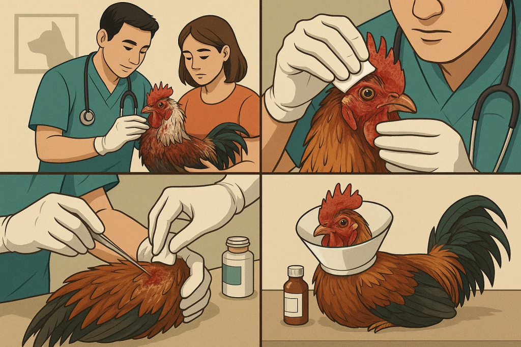 Sau ổn định ban đầu, rửa bụi bẩn quanh vết rách bằng nước muối sinh lý hoặc nước sạch ấm chảy nhẹ. Tránh kỳ cọ mạnh; thấm khô bằng gạc. Vết nông để thoáng; vết rỉ máu che gạc mỏng; thay khi ẩm bẩn. Toàn bộ quá trình nên diễn ra nhanh – gọn – êm, hạn chế tối đa đau đớn cho gà trống.